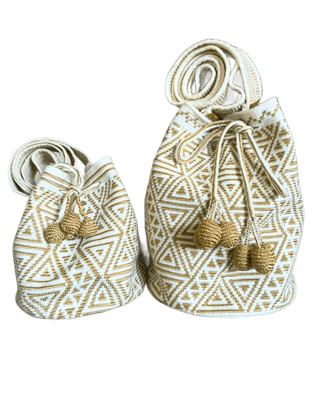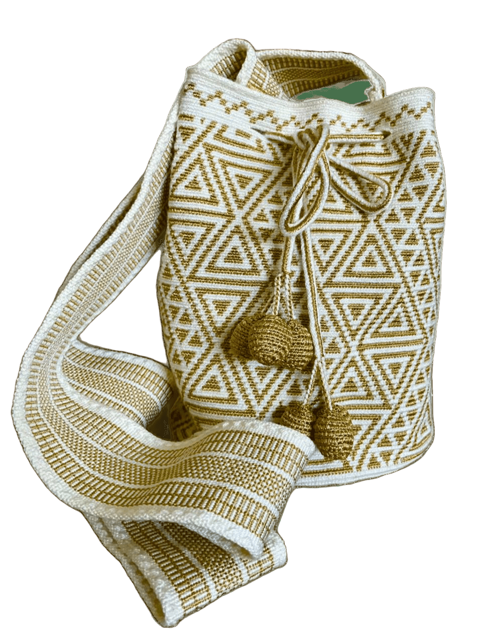 Mochila con diseño en hilo dorado y blanco, 100% tejida a mano.